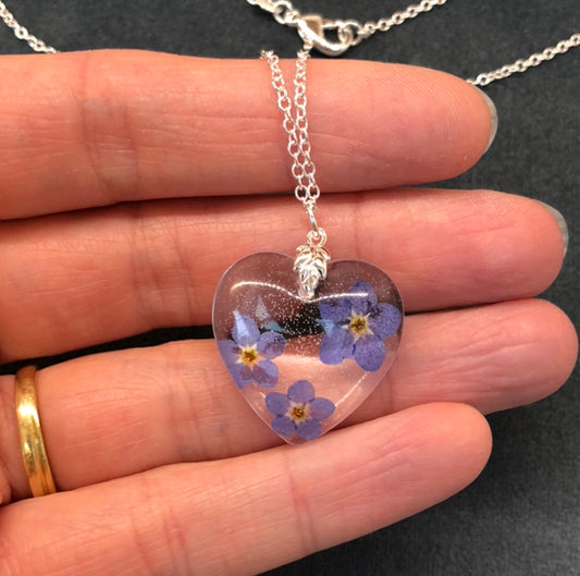 Delicate Florals pressed Forget me not flowers in epoxy resin necklace on 925 silver plated 18” chain with lobster claw fastener.