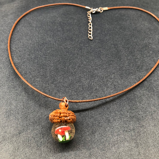 Acorn Necklace, handmade polymer clay acorn cap and tiny mushrooms inside crystal clear epoxy resin