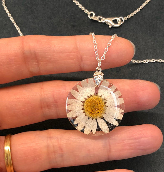 Dainty Florals - Delicate pressed Daisy in epoxy resin necklace on 925 silver plated 18” chain with lobster claw fastener.