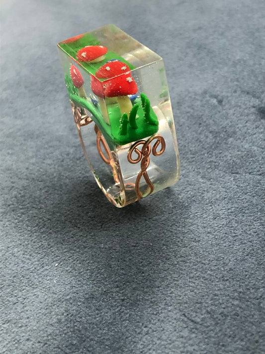 Mushroom Ring hand sculpted mushrooms and entwined copper wire encased in hand poured epoxy resin.